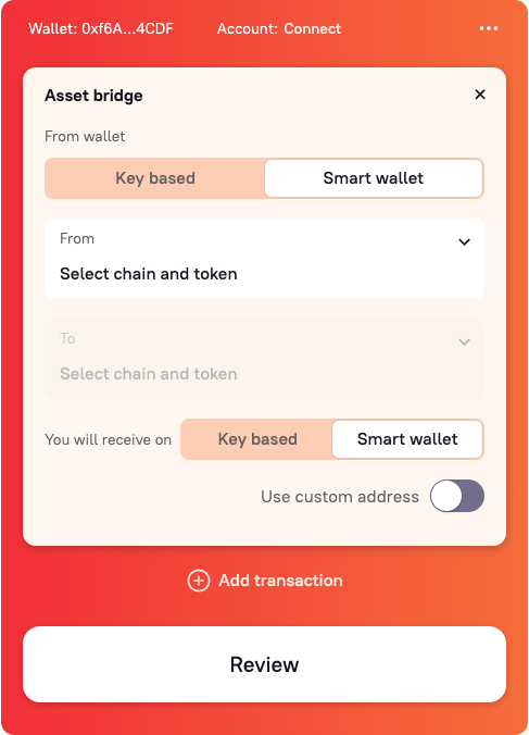 The Etherspot BUIDLER React component allows anyone to implement transfers, contract interactions, swaps, crosschain bridging and more into their own dApp with just a few lines of code.
